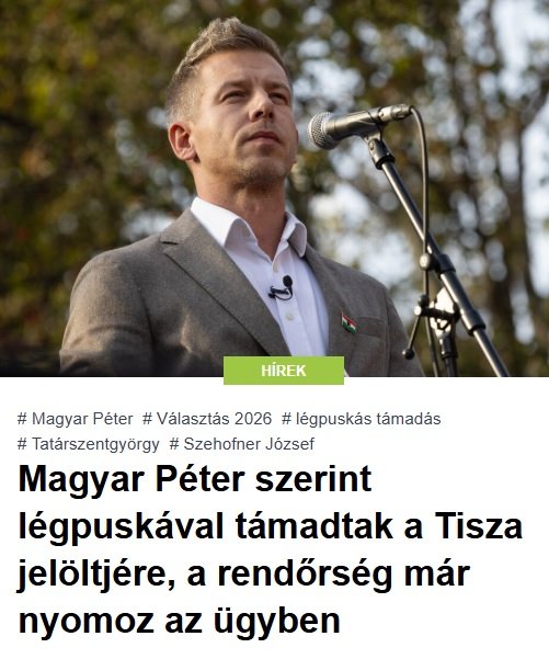 Büntetőeljárásban vizsgálja a rendőrség a Tatárszentgyörgyön történt légpuskás támadás ügyét, amelyet Magyar Péter hozott nyilvánosságra szerdán. A Tisza Párt alelnöke a Facebook-oldalán azt írta: