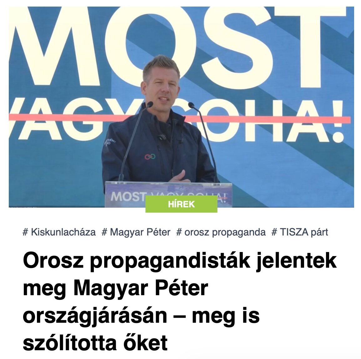 Szerdán Kiskunlacházán folytatta országjárását Magyar Péter, ahol a Tisza Párt elnöke az orosz propagandának is üzenetet küldött. A helyszínen orosz tudósítók is megjelentek, akiket Magyar Péter külön is köszöntött.